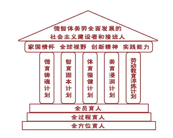 “德育铸魂计划”注重构建“家国情怀”的通识教育、思政课程和课程思政、日常思政融会贯通的德育体系,让思政教育、价值引领像“空气”一样无处不在。“智育固本计划”通过专业教育、贯通培养、科教协同构建起可应对变化、塑造未来和时代所需的一流人才智育体系。“体育强健计划”以身心健康、锻炼习惯培养和校园体育文化为重点,改革课程设置、教育模式和考核模式,引导学生天天锻炼、健康成长、终身受益。“美育浸润计划”通过高地建设、审美教育、体验教育,提升学生感知享受和创造美的能力。“劳动教育淬炼计划”从生活劳动、专业劳动实践和公益劳动三个维度,实现劳动教育的三层次目标:具备生存发展需要的基本劳动能力和良好行为习惯、系统掌握与专业相关的劳动知识与技能、具有乐于服务奉献的劳动精神。学校还将以“岗位说明书”的形式明确各工作岗位的育人职责,将《天津大学师德公约》要求融入岗位职责中,出台岗位“工作行为规范”和“负面清单”,从招生、入学、培养到毕业,对学生实现全环节、有针对性地引导和帮助,同时抓住学生成长中的关键环节,分层次、分阶段教育,营造全方位育人环境,从线上线下的空间维度,营造“一草一木皆育人”的环境氛围。